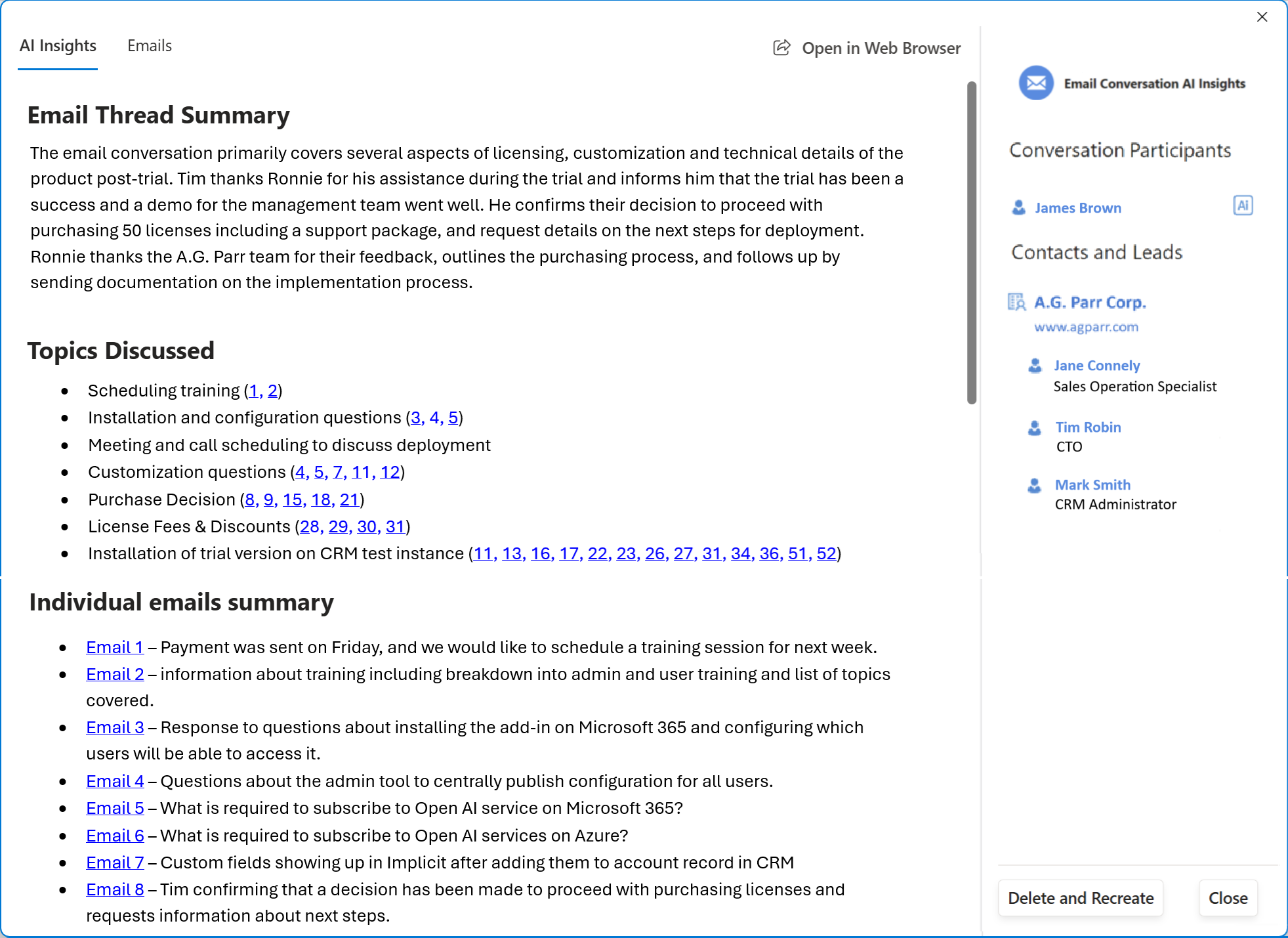 Create one-line per email concise summary allowing you to review long threads very quickly.Store and Share AI Insights via CRM