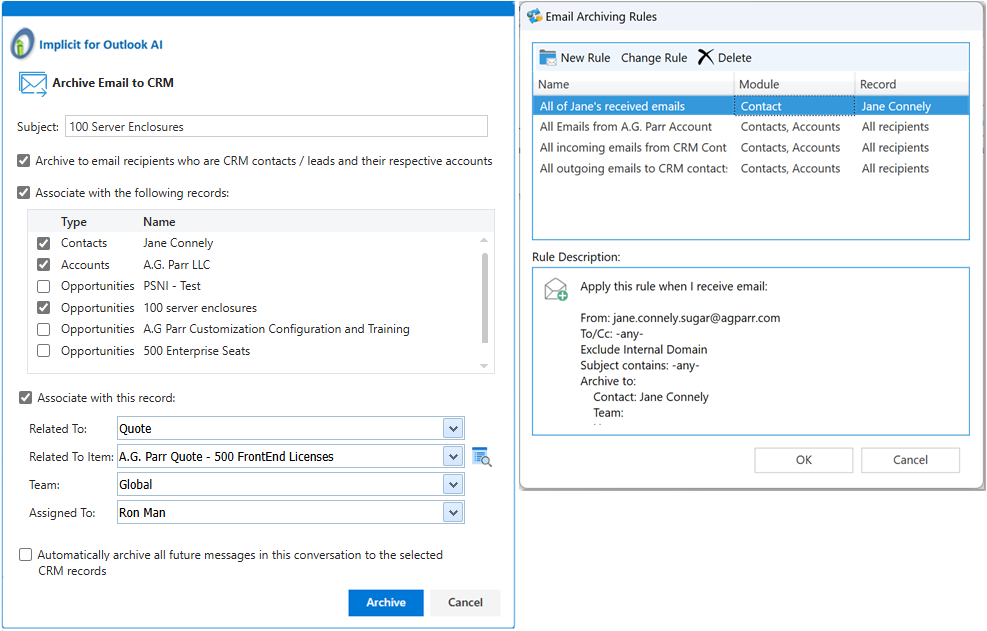 Custom modules, custom fields, and customized views are dynamically and automatically detected and presented in Outlook.Archive Emails in CRM Records