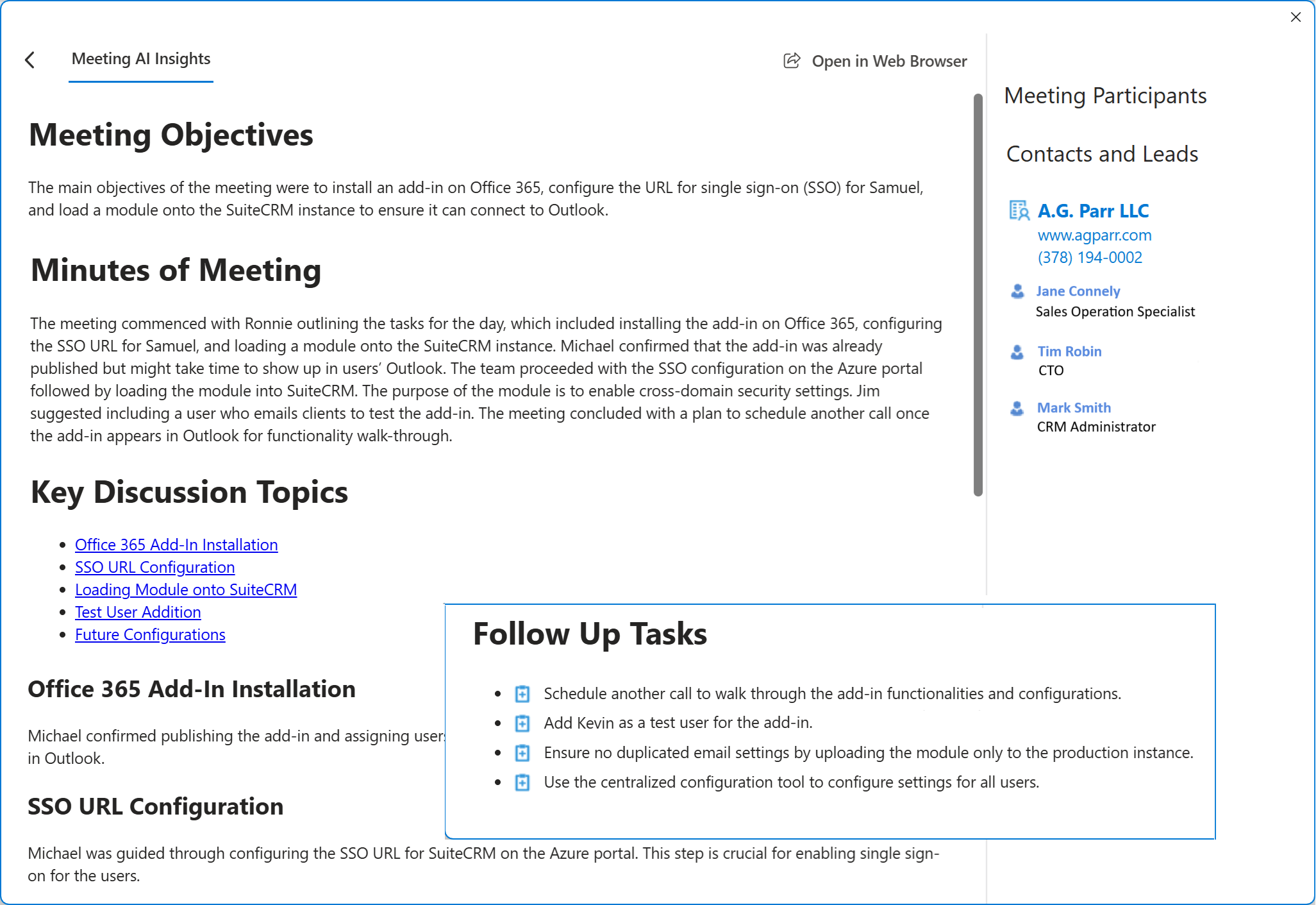 Let AI generate a summary of customer meetings including meeting objectives, participants, minutes of meeting, key discussion topics and follow ups.Convert Action Items into CRM tasks