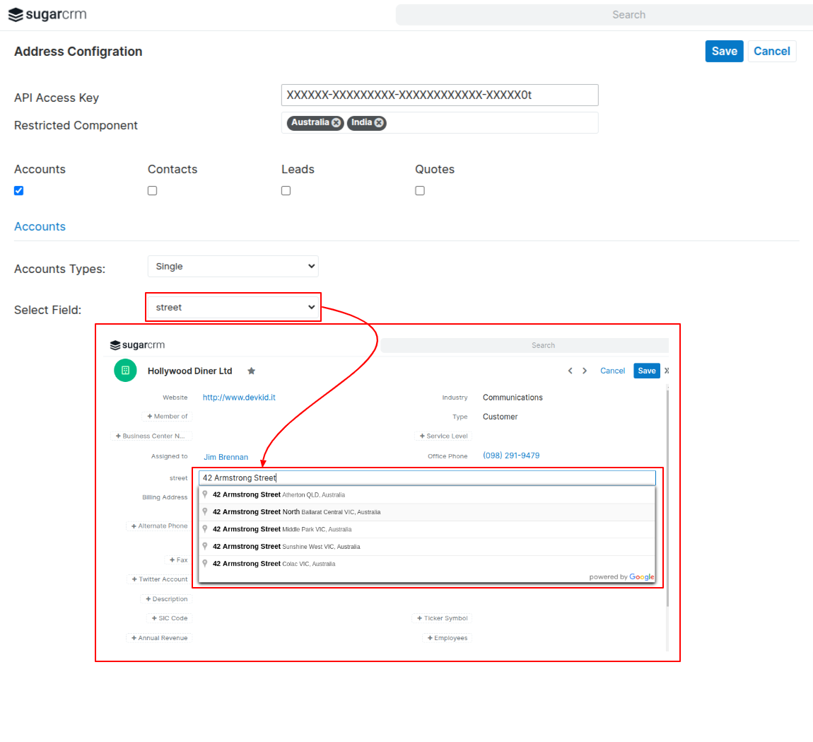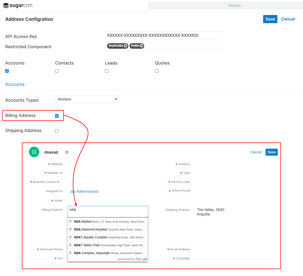 Improve address accuracy and user experience in SugarCRM with the Google Address Autocomplete Plugin. Integrated with the Google Places API, this plugin offers real-time, intelligent address suggestions as users type. It automatically fills in key address fields such as street, city, state, postal code, and country—minimizing manual errors and saving time. Seamlessly works with Leads, Contacts, Accounts, and Quotes modules, ensuring consistent and clean address data across your CRM.