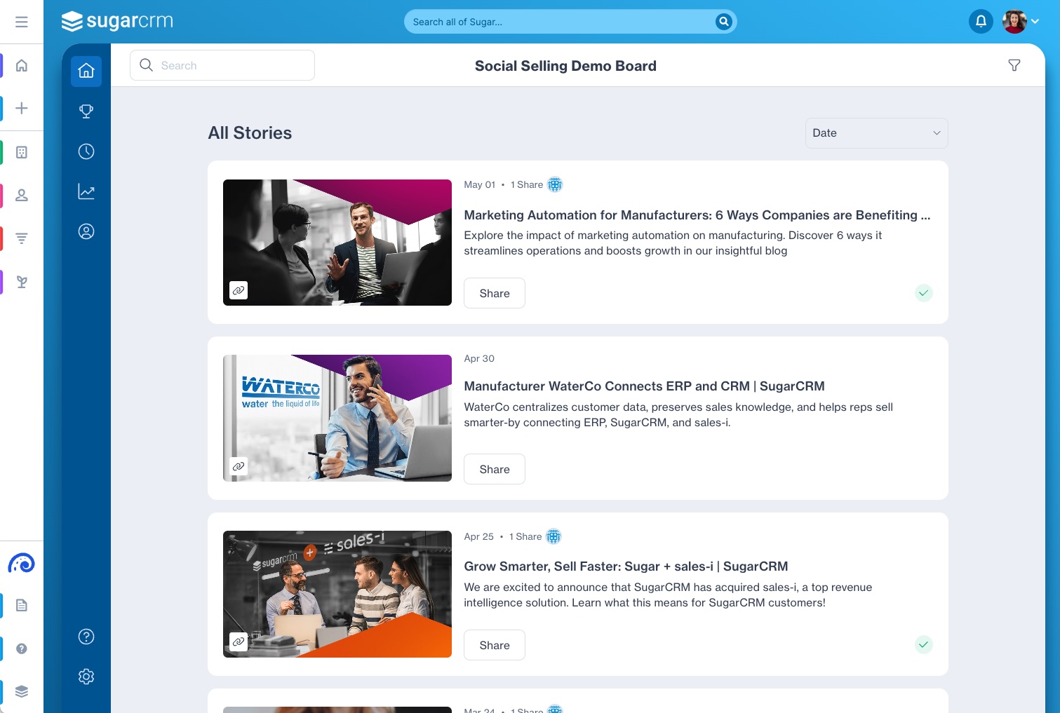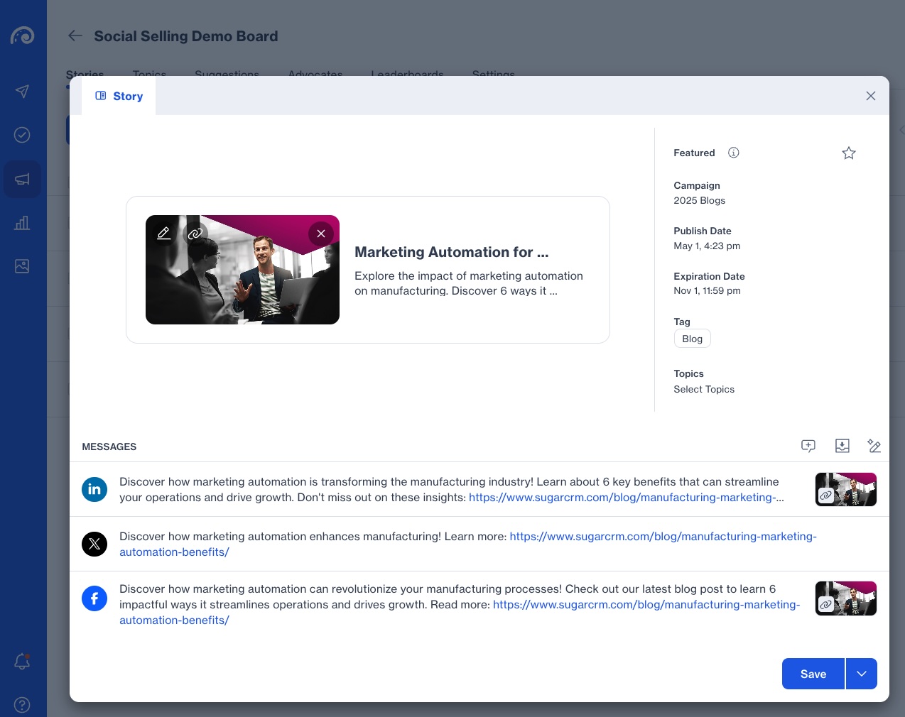 Browse and select content to share via Seller's connected social networks on Advocacy Board embedded directly within Sugar Sell or Sugar Enterprise. Sellers can use the suggested message or modify it themselves (or with the help of AI) to put their own spin on it.