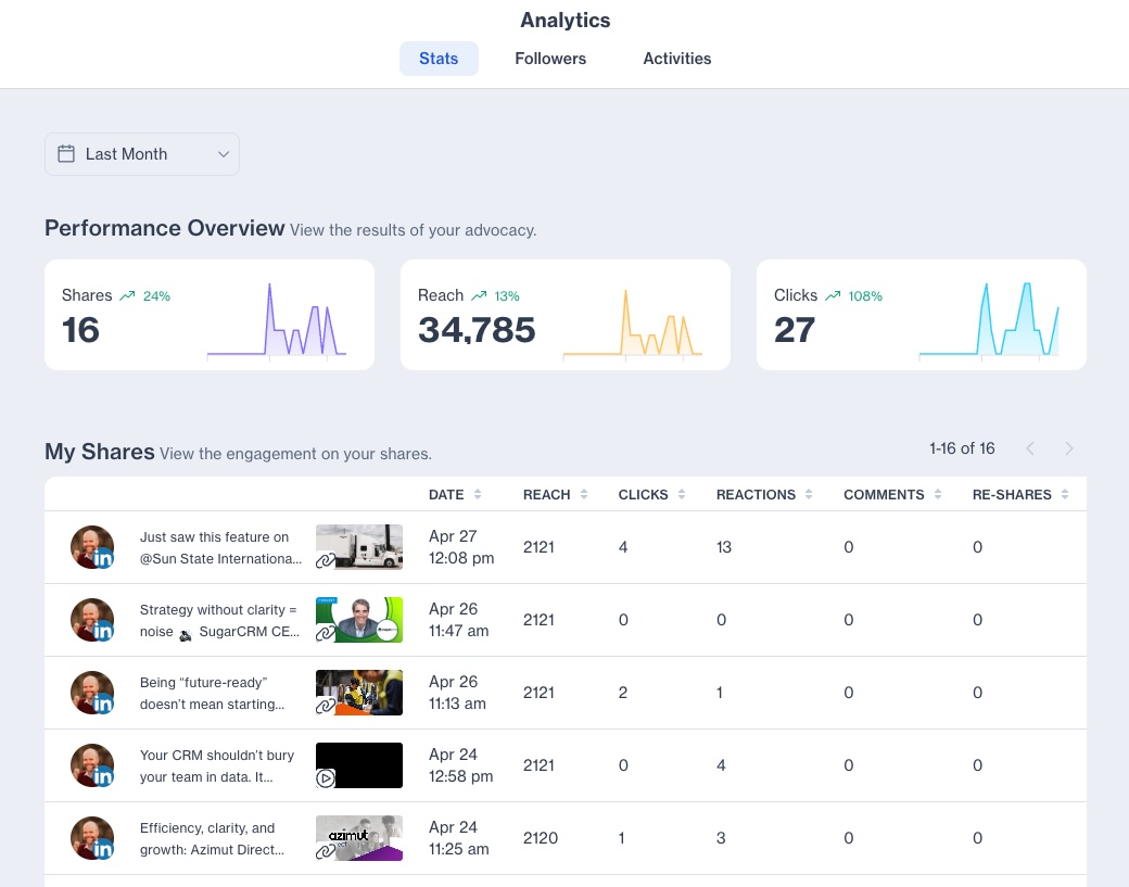 Sellers can analyze the effectiveness of their own social selling efforts on the Analytics Dashboard.