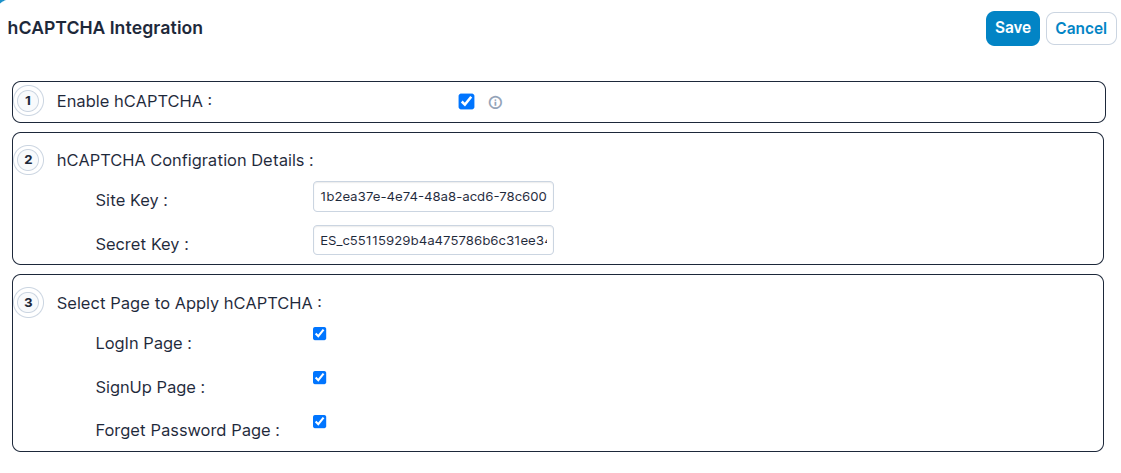 - Navigate to Admin > Configuration. First, enable the functionality, then set the site key and secret key, and finally select the page where you want to apply this functionality.